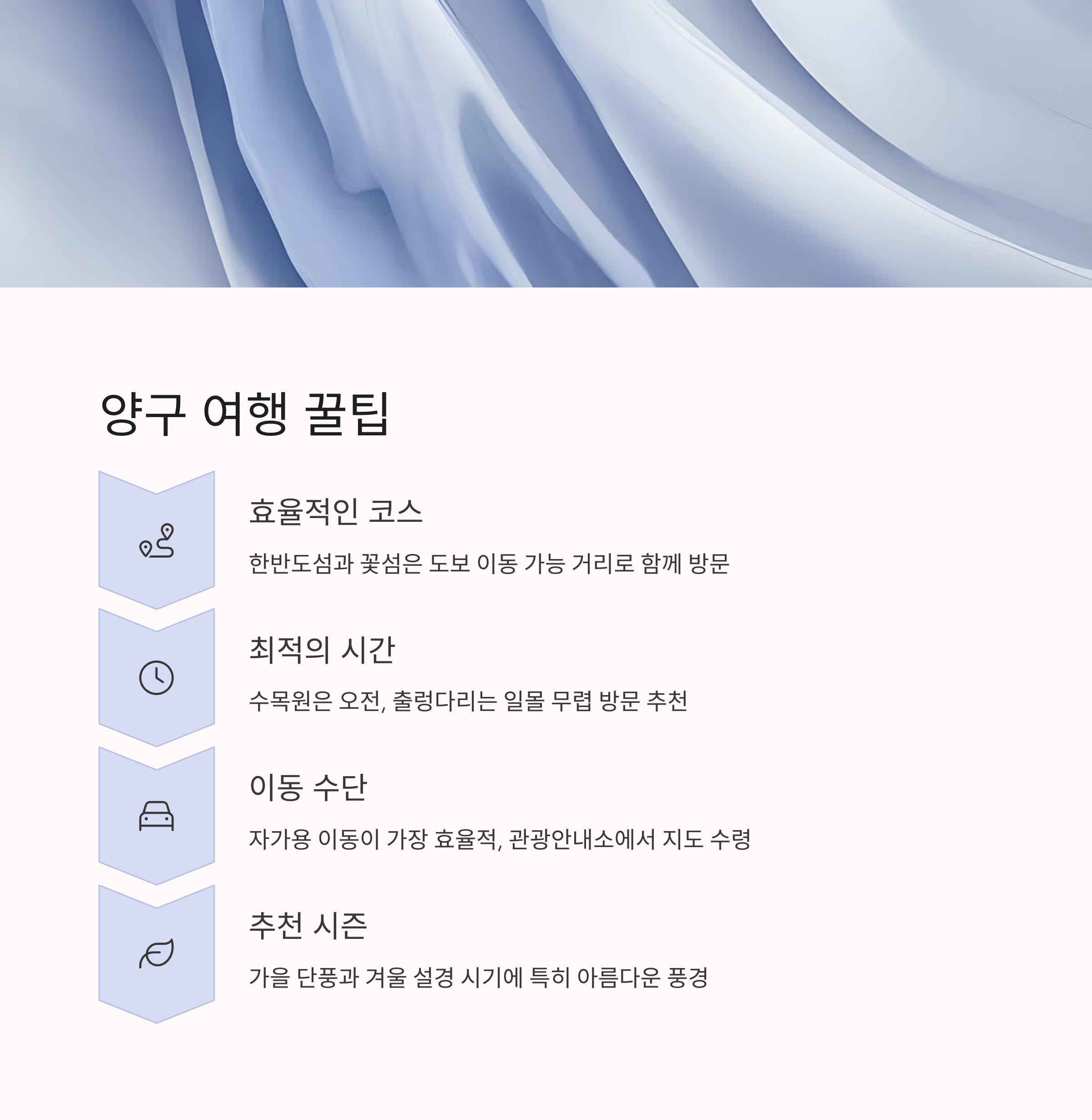 - 자가용 이동이 가장 효율적이며, 양구군 관광안내소에서 지도 수령 후 경로 계획을 추천합니다.