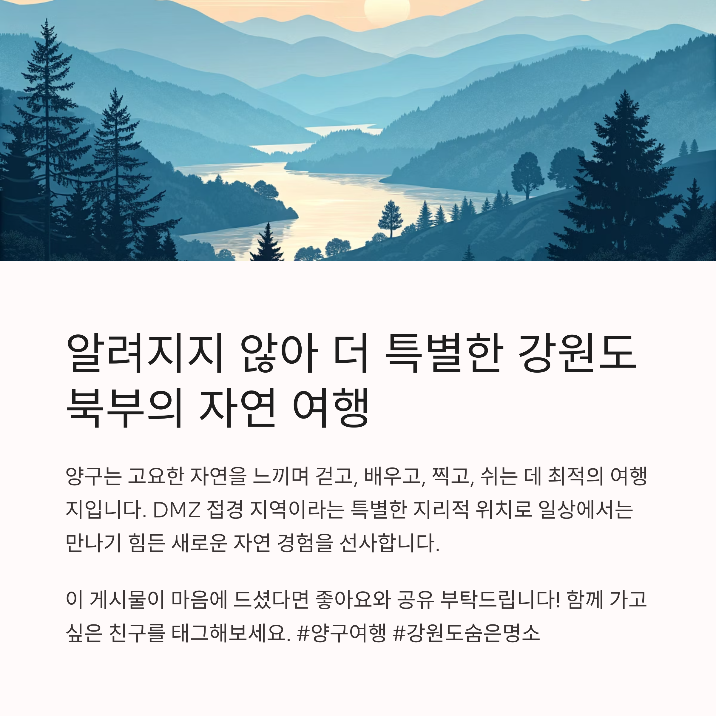 양구는 대중적 관광지보다는 조용하고 덜 알려진 자연 명소 위주로 구성되어 있습니다.
