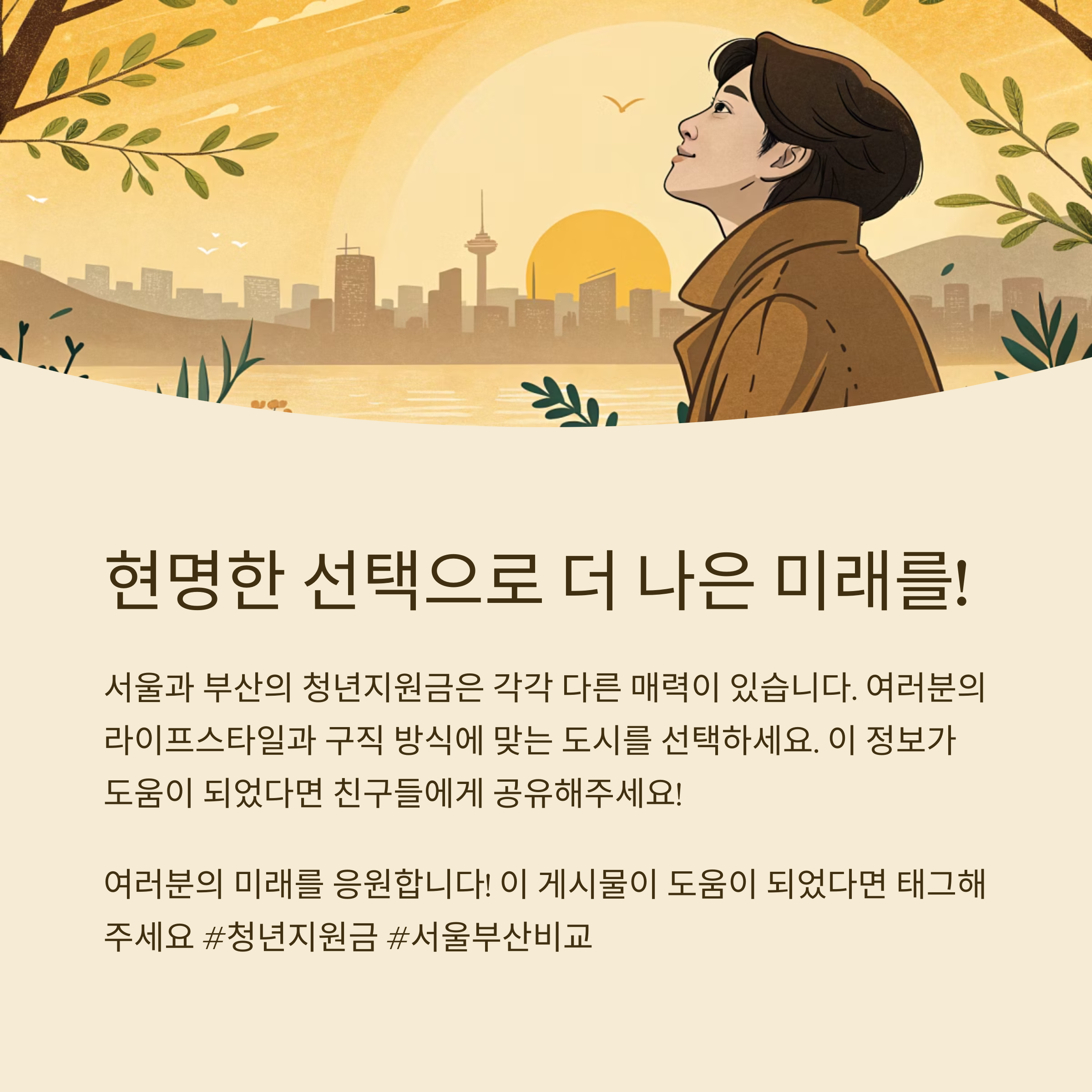 어때요, 서울과 부산의 청년지원금 정책들, 생각보다 차이가 꽤 크죠? 사실 저도 비교해보기 전까지는 이렇게 다른 줄 몰랐어요. 제 기준으로는 서울이 더 매력적이었지만, 누군가는 부산이 훨씬 현실적인 선택일 수도 있겠다는 생각이 들었죠. 결국 중요한 건 내가 어떤 환경에서 더 잘 성장할 수 있느냐는 거예요. 오늘 정보를 바탕으로 여러분도 현명한 선택 하시길 바랍니다. 그리고 궁금한 점은 언제든지 다시 찾아와 주세요. 우리, 더 좋은 미래를 향해 같이 가요!