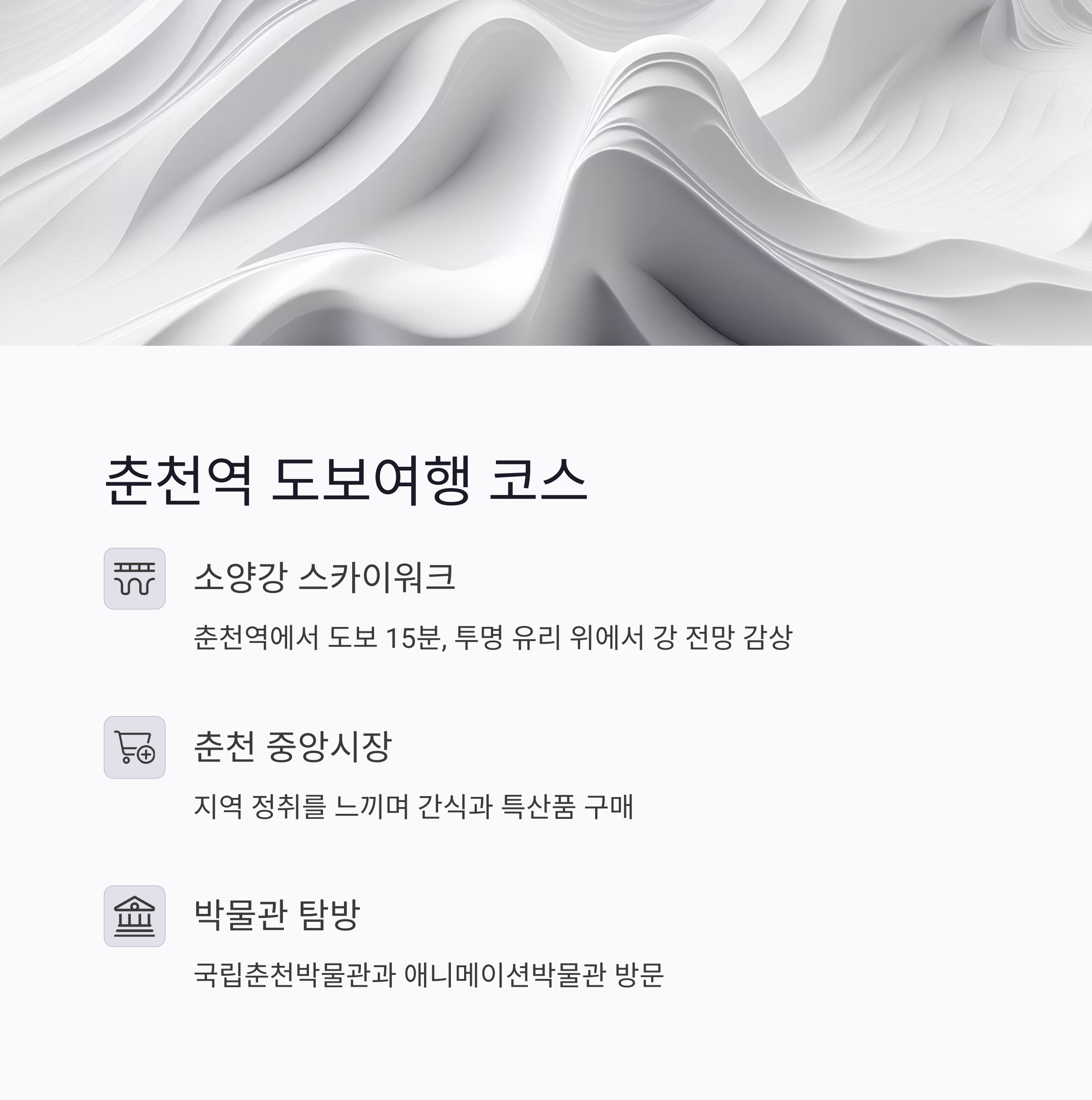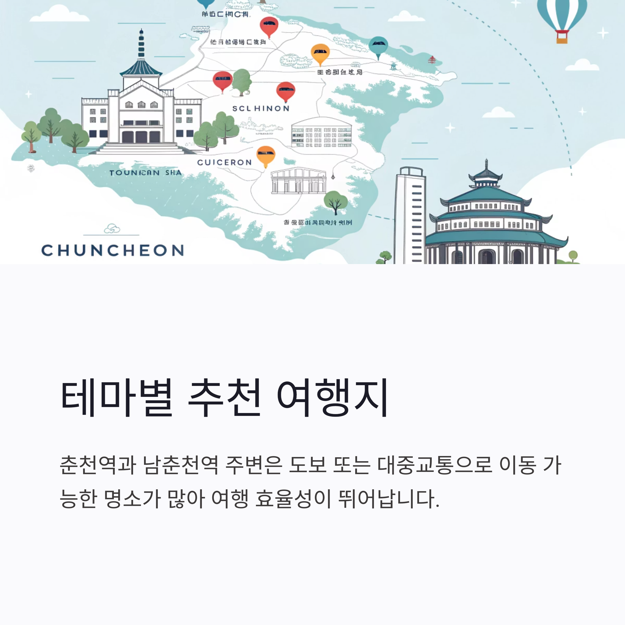춘천역과 남춘천역 주변은 도보 또는 대중교통으로 이동 가능한 명소가 많아 여행 효율성이 뛰어납니다.