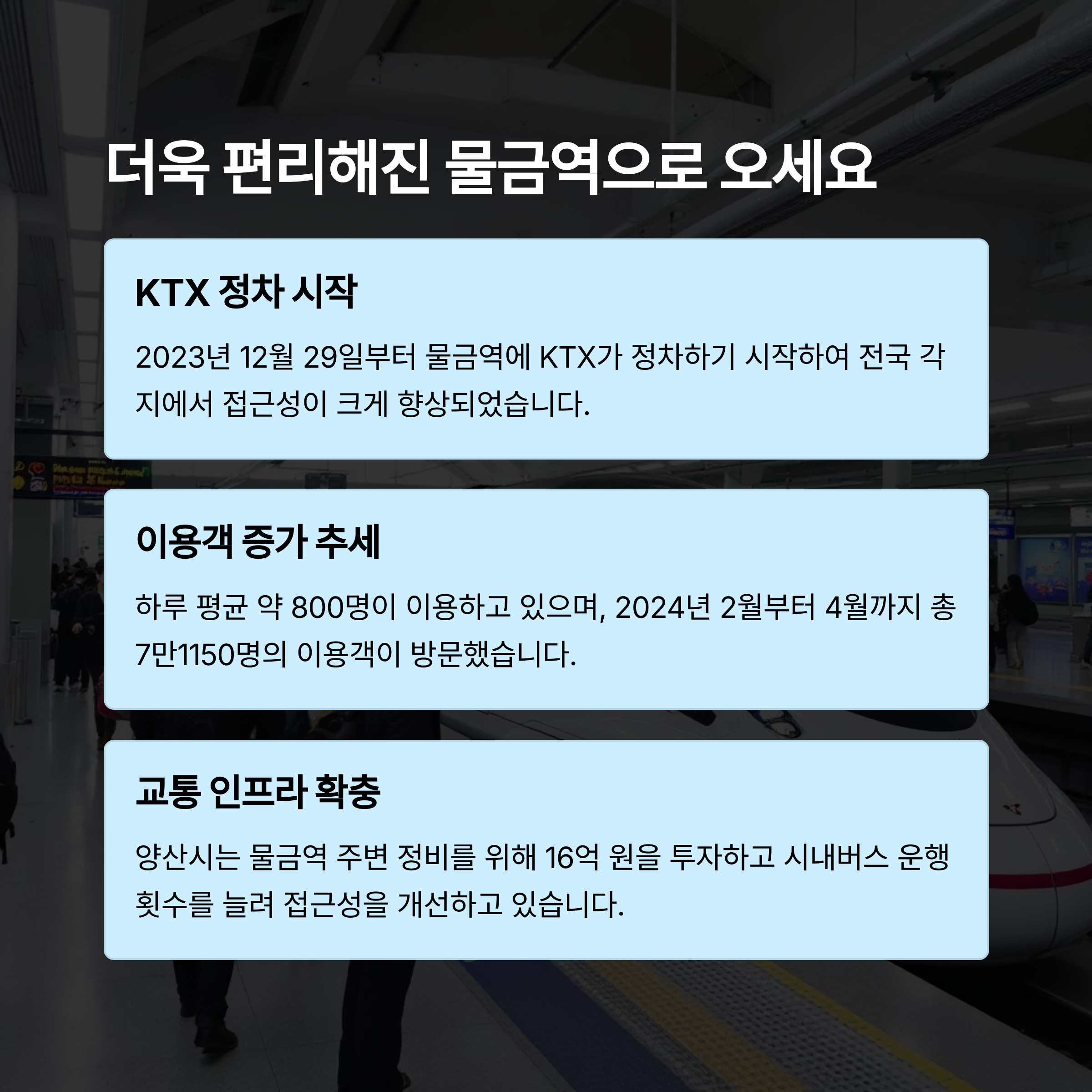 물금역 KTX 정차는 교통 접근성을 개선하며 지역 상권 발전에도 직간접적인 도움을 줍니다.