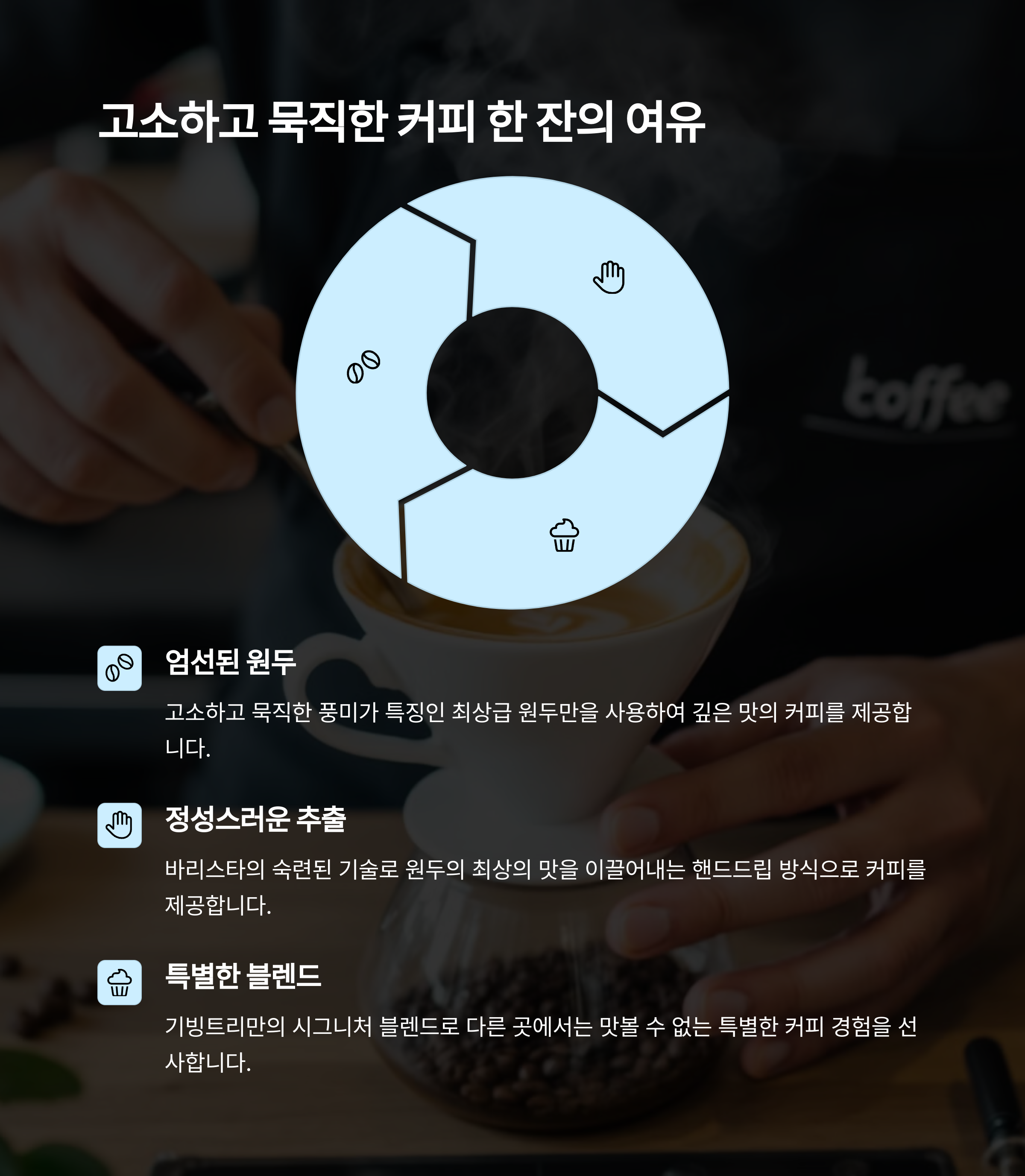 음료 메뉴는 1인 1음료 필수이며, 고소한 원두로 만들어진 커피가 큰 호응을 얻고 있습니다.