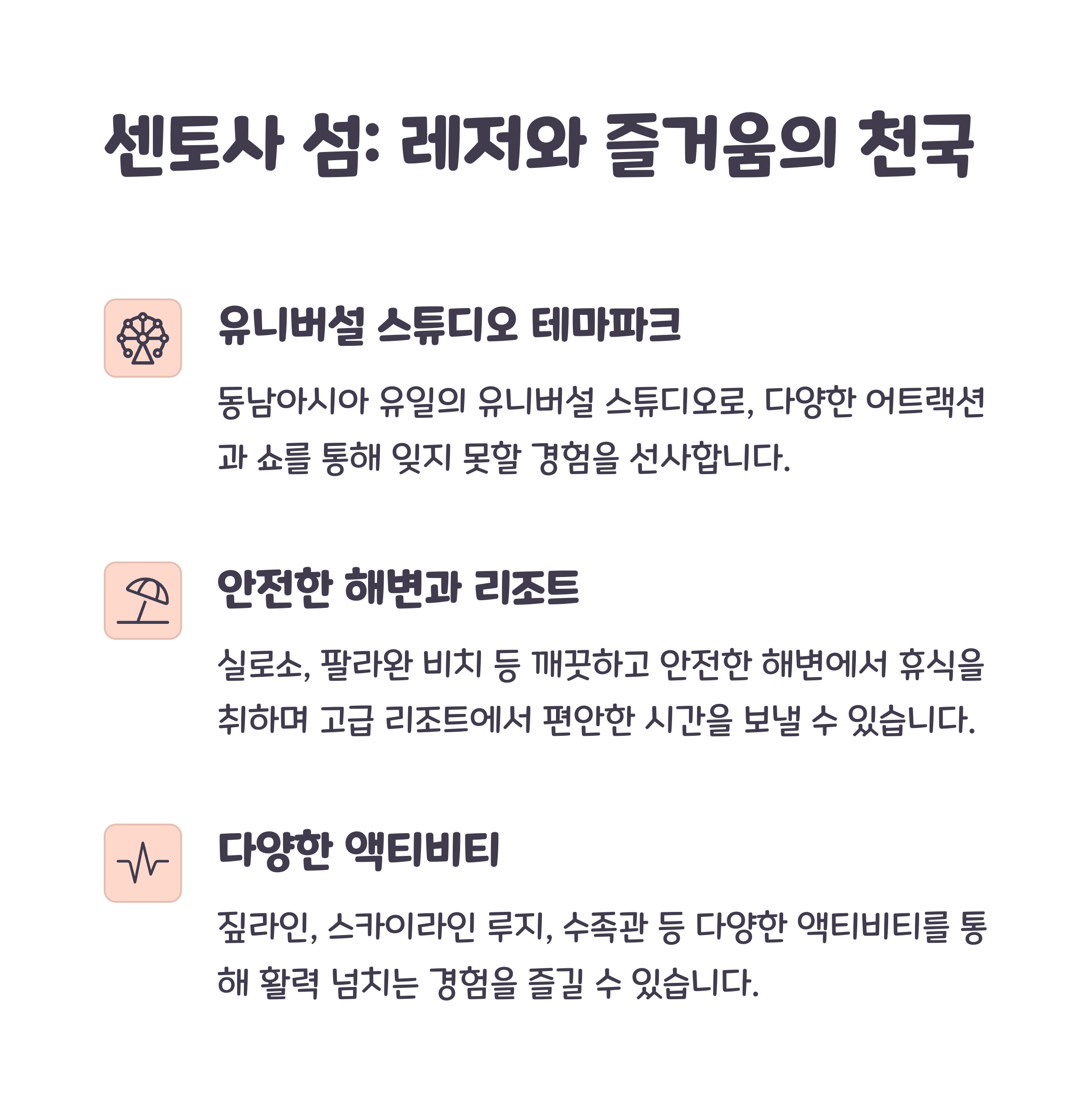 두 번째 추천지는 센토사 섬으로, 다양한 해양 스포츠와 테마파크를 즐길 수 있습니다.