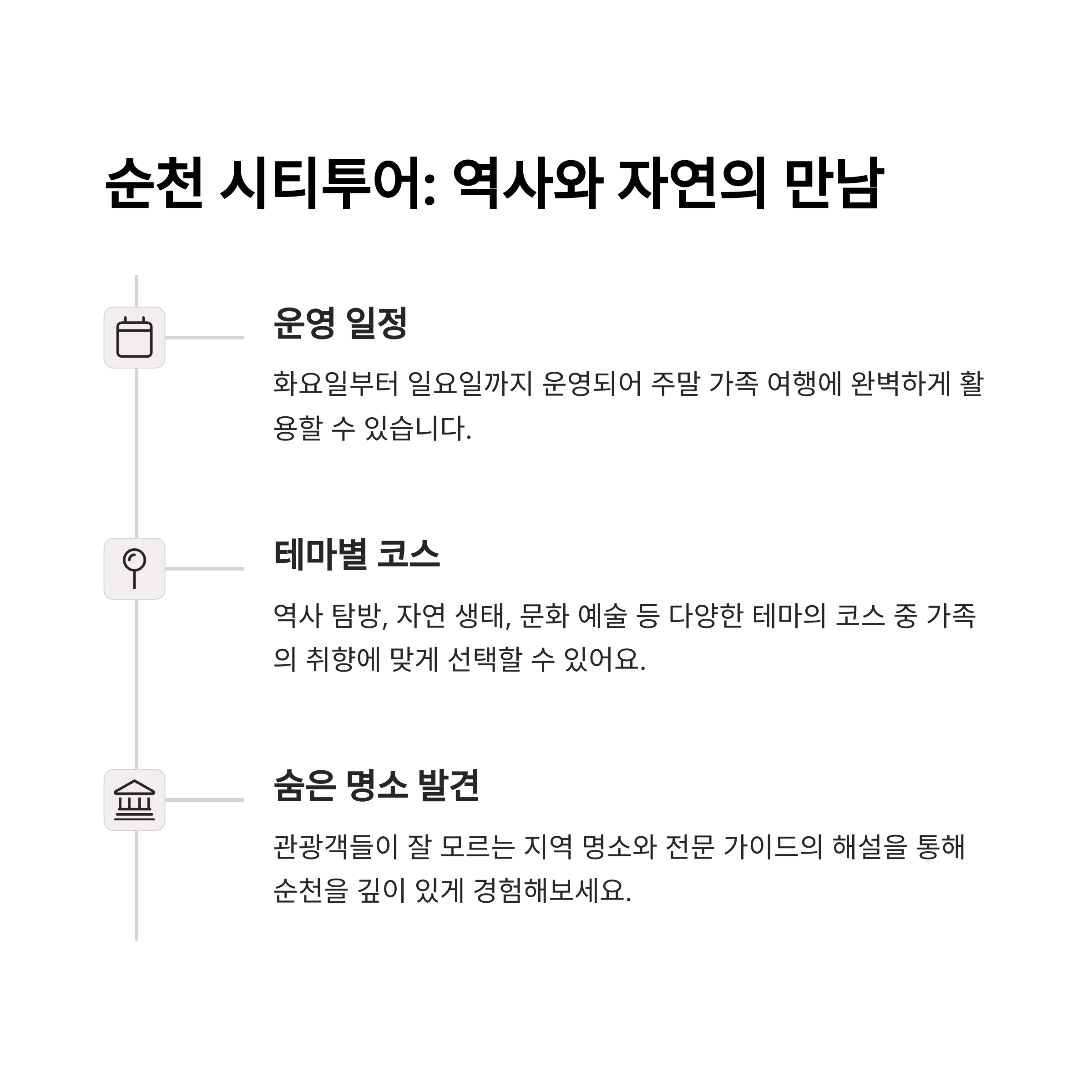 또한 순천 시티투어는 주중과 주말에도 운영되며 자연과 역사적 명소를 다양하게 탐방할 기회를 제공합니다.