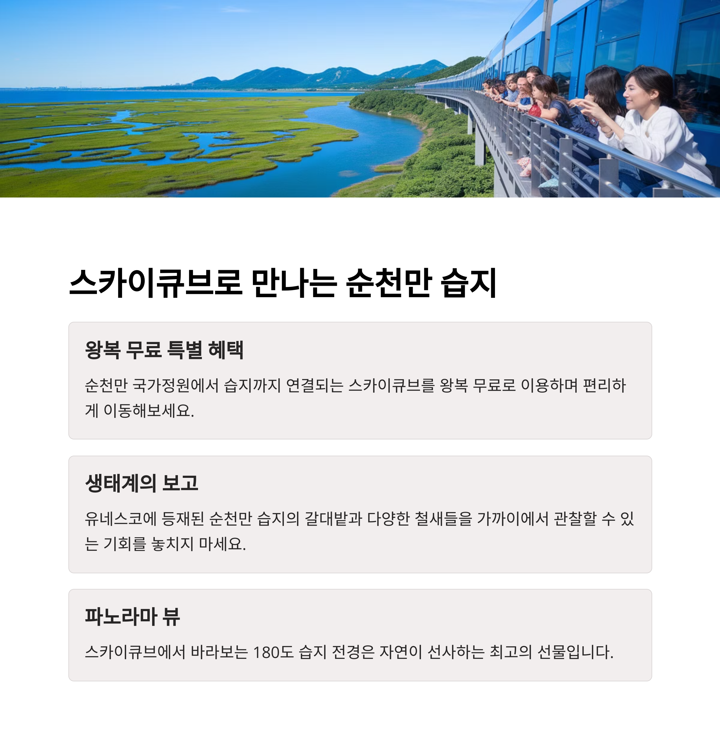 스카이큐브를 활용하면 순천만 습지와 정원으로 편리하게 이동할 수 있어 시간 절약에 매우 유용합니다.
