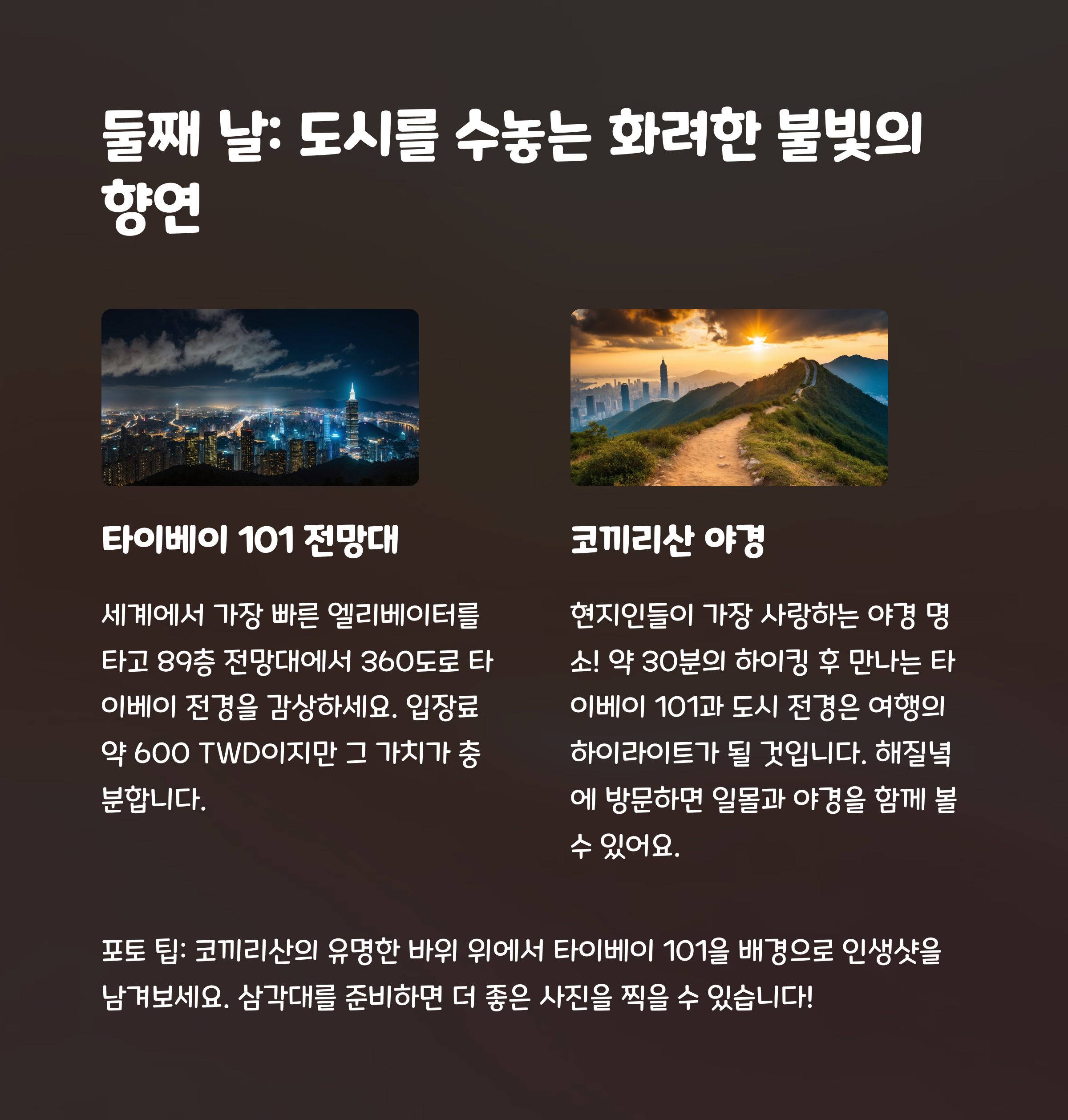 특히 야경 명소는 타이베이 여행에서 빠질 수 없는 하이라이트로, 각 장소의 매력을 꼭 경험해 보시길 추천드립니다.