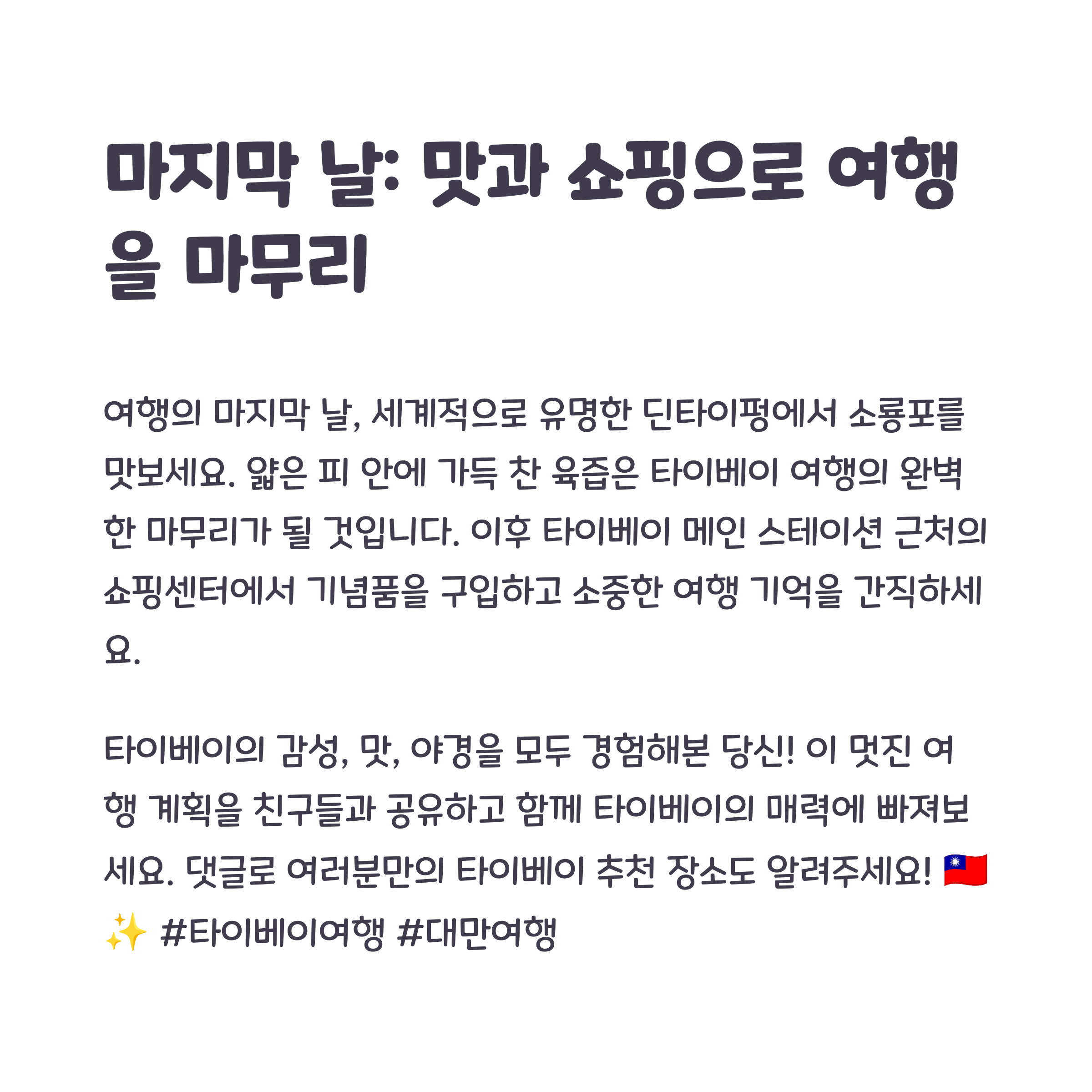 마지막으로, 현지 음식을 즐기는 것도 대만 여행의 커다란 즐거움 중 하나로, 야시장 방문을 통해 다양한 요리를 경험해 보세요.